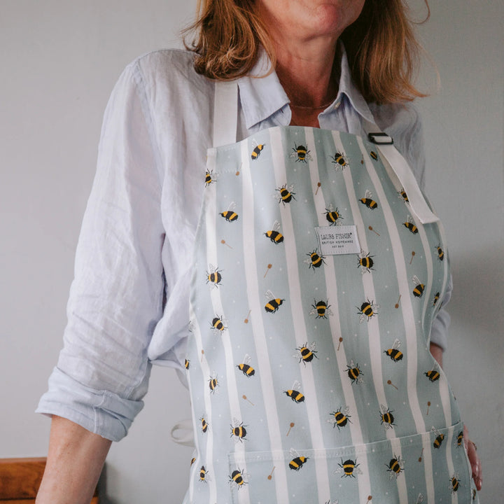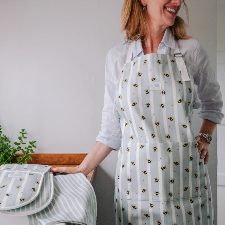Our honey bee design is perfect for bringing a bright buzz to any kitchen, featuring British honey bees on our signature pastel blue pinstripe.